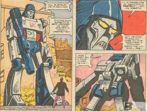 There is a huge tone shift between issues #4 & #5. The dialog was less stiff. Shockwave appears but he takes over as leader of the Decepticons and proves himself quite competent. The Autobots (except for Ratchet) don’t appear until issue #9, but they seem more lifelike and with more life in general than the early issues. The story arc featuring Ratchet having to battle Megatron did more for the character than the cartoon did, and his dealings with The Mechanic (a human who stole his medical tools to use as weapons) improved on that. He certainly handled Optimus Prime’s death better than Optimus did Ratchet’s under Simon Furman.