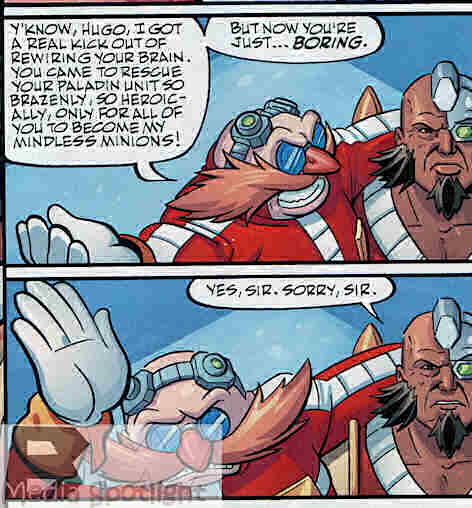 What they got right: Snively’s ties to Hope is interesting. As the only family he has (Eggman is a computerized copy of his uncle from another dimension…comics, everybody!), Snively does seem to honestly care about Hope, but he’s still evil and Hope isn’t. It’s a relationship I wouldn’t mind seeing explored at some point. I also like the design on the “egg” arsenal, especially the Egg Camel, sort of what would happen if Eggman designed an AT-AT.
