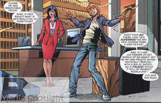 After rescuing a sub Superman returns home where Lois reads Clark the riot act for not picking up Lucy. However, a new supervillain, Anguish, appears to have daddy issues as well as superpowers and as if Superman needs another distraction a blogger claims proof that a man other than Clark Kent is the true identity of Superman–and this guy has a wife and daughter.