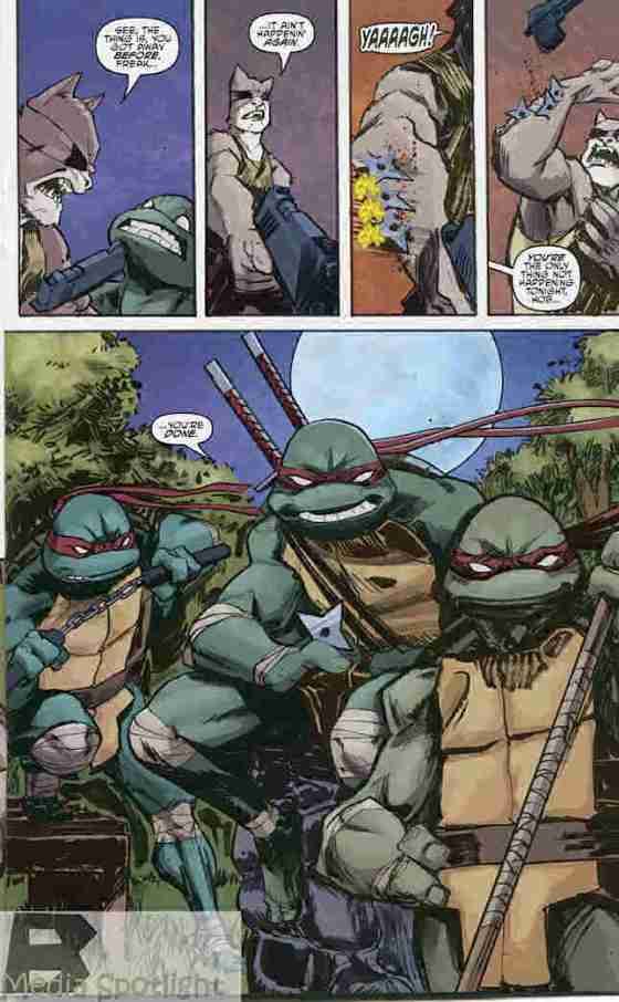 Old Hob has Raphael and Casey cornered and we learn Hob is working for Stockman to bring Splinter and the Turtles back to recover their experiment. The boys don’t fare well against Hob’s goons, until the other three Turtles arrive, reuniting the brothers at last.