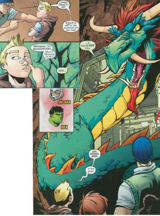 The Avengers are currently in the “last chance” theaters, but they’re still in our hearts. Not so much some of our comic shelves because Bendis may be a good writer, but not when it comes to The Avengers. The last time I read a good Avengers story was when Paul Tobin was working on the Marvel Adventures version. For tonight’s fight, we return to those days as the Mandarin kidnaps an entire classroom.