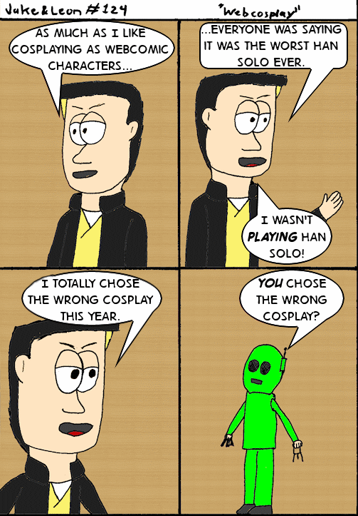 By the way, Jake is portraying Larry Forest and Leon is playing Bolts, characters from Luke Foster’s Moon Freight 3. I ran into Luke at two out of three cons this year and if you follow my Twitter feed you know I’m a fan of his work, including his new comic, an all-ages series called The Center of Somewhere. Plus you may notice he’s one of the inspirations for the eyes as far back as “proto-Jake”.