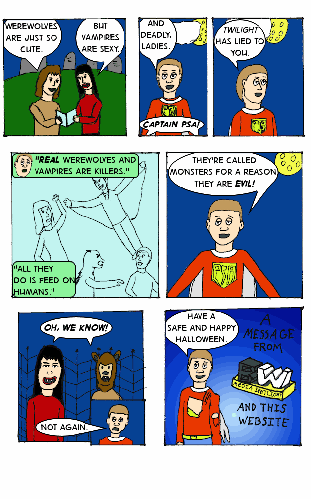 That said, monsters make great villains, or occasionally heroes when trying to repay their debts. Twilight has altered the perceptions of vampires and werewolves. How can we warn young women that they aren’t sparkly god-men looking to engage in tortured romance but something to be feared less their blood be drained? Luckily we still have one superhero ready to take up that cause: