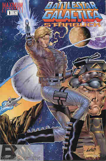 It’s a good time cycle for Starbuck. He’s won another session of Pyramid and he’s getting ready for a date with Casseopeia (her one comic appearance under Maximum Press’ run). Then things begin to go wrong when an Eastern Alliance ship attacks. It’s Leiter, who’s still angry about events in the episode “Experiment In Terra“. In the ensuing battle Starbuck’s Viper is damaged and he is knocked out, so the auto-pilot heads for the nearest livable planet. Which turns out to be a penal colony for the Eastern Alliance. Guess he used up all his good luck on the card game.