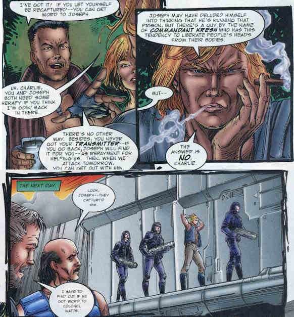 When we last left our hero (in a surprisingly good first issue), Starbuck had crash-landed on a planet because he tends to do that. Meeting up with members of a resistance on a Eastern Alliance penal colony, Starbuck goes to retrieve his radio (the talk to other people kind) and rescue a man named Joseph. He kind of failed at both.