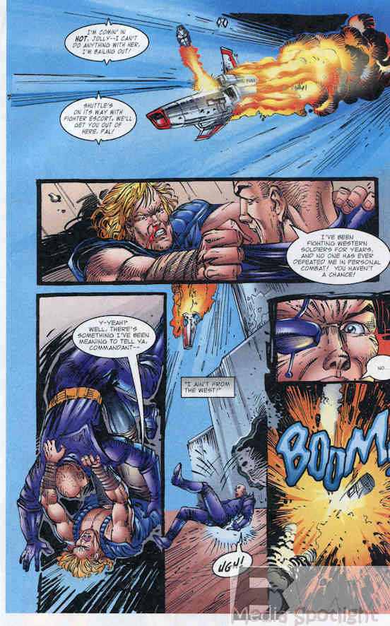 In space, the two groups arrive and battle commences. On the planet, Joseph and Justine have a happy reunion, but there are more prisoners in the underground bunker and Joseph want to get them out. Justine volunteers to go in his place and Starbuck decides to go with her. That’s probably a good idea because Kresh has gone on a shooting spree of his own men! In a scene that shows somebody doesn’t get the concept of “underground”, Starbuck and Justine are joined by another member and see the first Alliance destroyer begins its bombing run as Kresh sees them from…somewhere. I’m not really certain. Dang it, why did Liefeldian shenanigans have to pop up. Things were going so well.