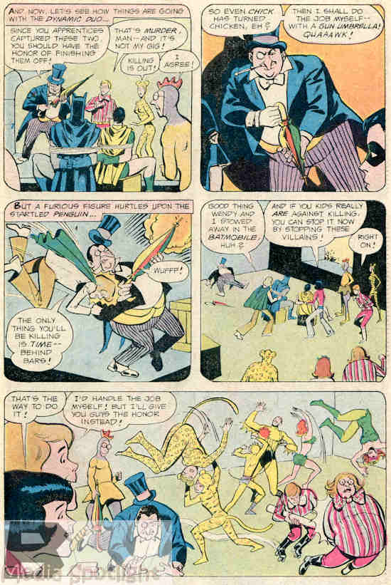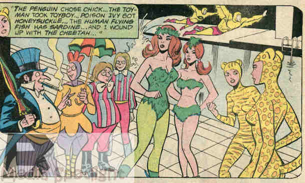 I want to make fun of Chick and Toyboy or wonder who in the name of Charlie Tuna the Human Flying Fish is but I can’t stop thinking that “Honeysuckle” is kind of under-dressed. Especially for someone who has taken the name “Honeysuckle” in a kids comic. I don’t think any of these kids are old enough to drive yet. Anyway, our villains have (long story short) taken the Dynamic Duo hostage and the Penguin decides to give the Junior Super Foes a reward. Well, to the Penguin it’s a reward.