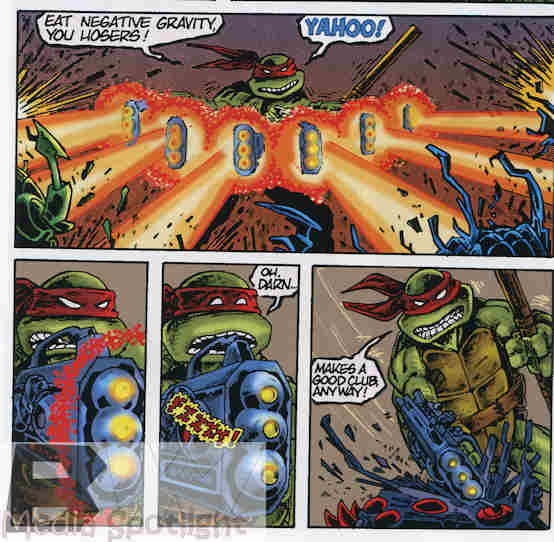 The colors are new but the comic is a reprint so I’m going with it. Last week I reviewed Donatello’s team-up with Jack Kirby (or a simulation) so tonight let’s see them in action. Actually, most of the comic is one huge fight so I’m just going to show my favorite moment from the fight.