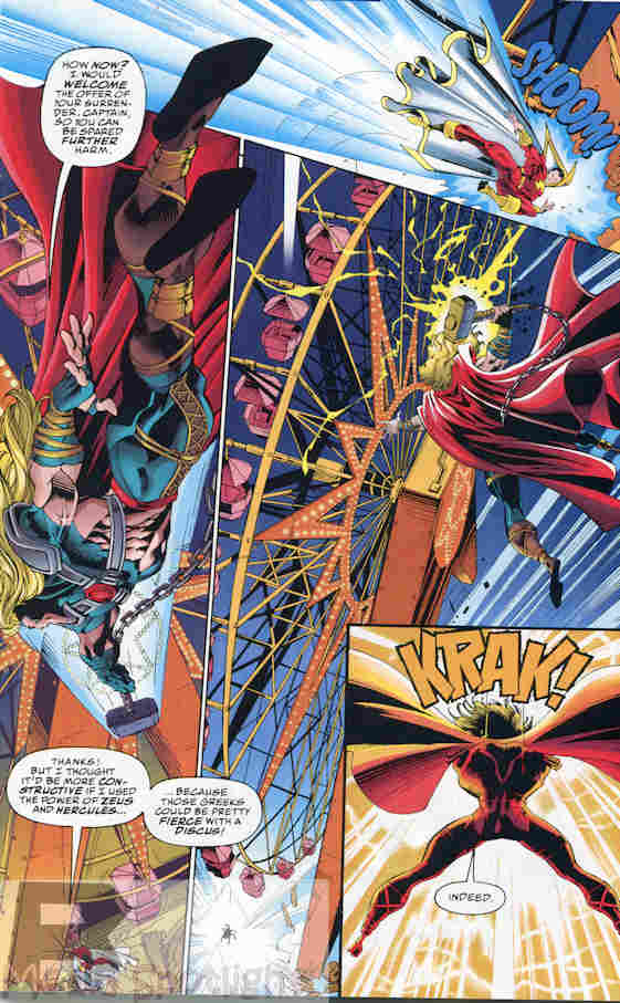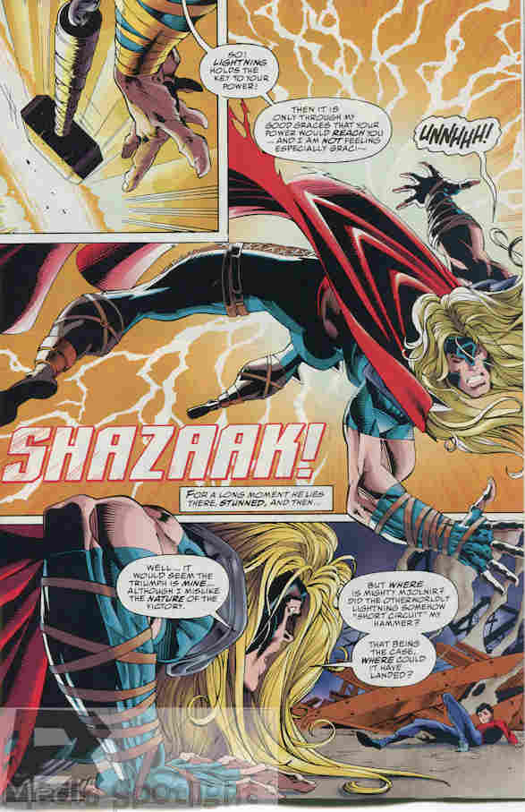 And a point was won for the Marvel Universe. I don’t remember if there was a decisive winner because Access sort of rigged the game to a draw. And his hammer? Ended up in the hands of Wonder Woman. How do you like them golden apples?