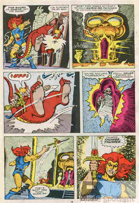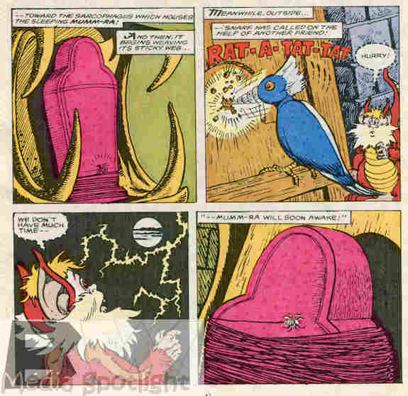 Snarf finds the Thundercats mummified alive and the Sword hanging near the sarcophagus. But with that strong Third Earth spider webbing around his box, Mumm-Ra is going to be held up (dodged that pun).