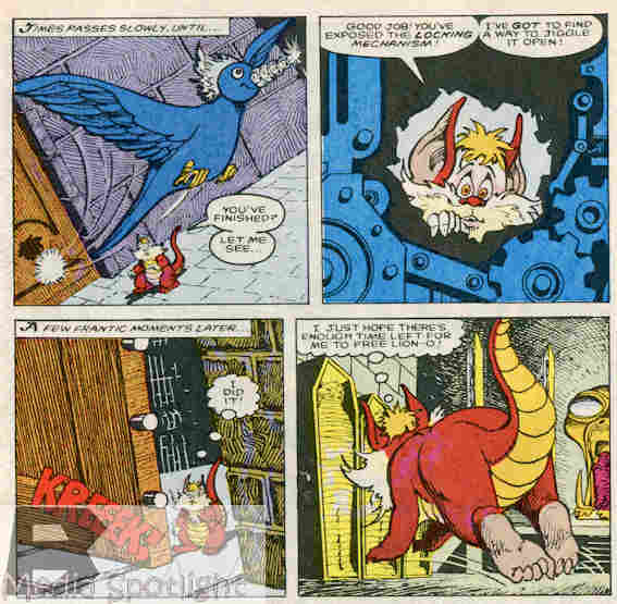 Using dirty tricks the Mutants were finally able to capture the Thundercats and bring them to Mumm-Ra’s pyramid. Snarf, who in the comic version was out helping an animal make a nest (one of a few minor changes between the episode and the adaptation), learns of his friends’ fate and gathers his courage to break into the pyramid…but not without a little help.