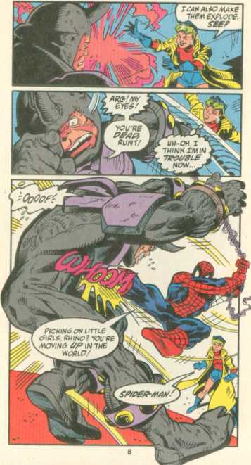 Professor X sent Jubilee to check out Empire State University as a potential college when the Rhino shows up. His goal is a self-powered energy generator being demonstrated as a science expo at ESU. Jubilee is barely able to distract the Rhino until Spider-Man arrives to save the day. Rhino refuses to give up the name of his employer but does suggest Spidey check the docs. As he swings away familiar hands grab Jubilee.
