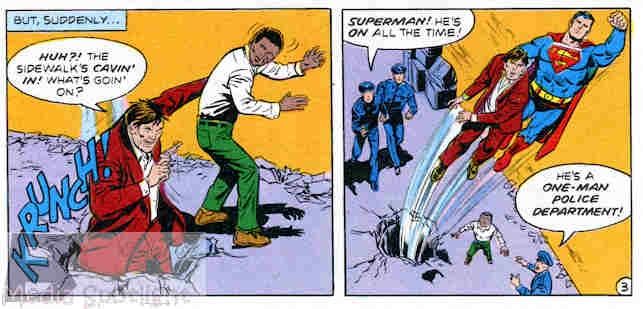 But since this is the 80’s, we can’t have dead kids at DC! Now here’s the problem. Sure, Superman is faster than a speeding bullet, but it has a shorter distance to travel, so there’s a good chance that if he just rushes in to stop him the kid’s getting some new holes. So how to get out of this situation?