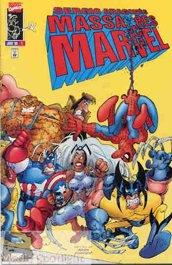 Sergio and Mark head to Marvel to look for work, but everyone is out to lunch. Sergio sees a note that the comics are behind schedule and he decides to help and finish the comics for them, coming up with a villain called the Seagoing Soarer. The Soarer is kidnapping Marvel heroes, starting with Sub-Mariner before going into the “issues”, as the mystery villain captures Spider-Man, The X-Men, Captain America, The Silver Surfer, and others. This leads to the obligatory Marvel heroes fight each other scene before the villain is revealed and only Sergio himself can stop him…for he IS him!
