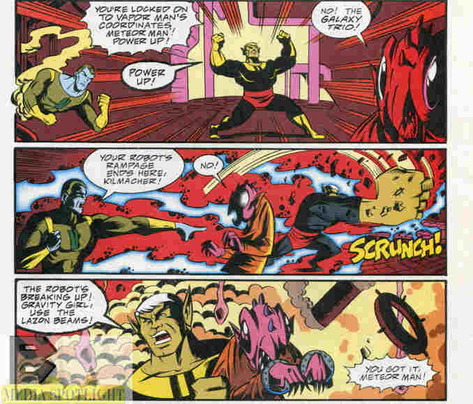 One of the Trio’s old enemies is attacking them with a giant robot. Why he gave the robot a sexy female form…I’d rather not know.