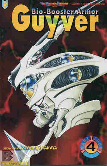 “Ultimate!” WRITER/ARTIST: Yoshiki Tokaya TRANSLATION: Fred Burke & Toshifumi Yoshida TOUCH-UP ART/LETTERER: Bill Spicer COVER DESIGN: Viz Graphics ASSISTANT EDITOR: Toshifumi Yoshida EDITOR: Annetta RomanThere’s not much to analyze this issue. It’s just Guyver and Aptom battling. Aptom does get to try to use the Enzyme 2 stuff to seal Sho’s Mega-Smasher, then destroys another Zoanoid because he wants Sho all to himself. However, Sho blocked the enzyme with his arms, damaging them. Then wills the Mega-Smasher open by itself, destroying Aptom. But is he really gone?