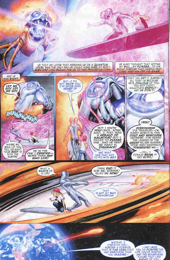 Long story short: One of Galactus’s former heralds is jealous of the Silver Surfer and wants him dead. Events cause Spidey and the Surfer to switch powers but Spidey’s use of the Power Cosmic is not enough against Primordius, and the power is killing the unprepared web slinger. So Surfer is able to take control and merge them.