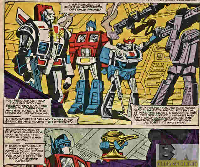 Time and again, he has earned the respect of his fellow Autobots and the humans they have sworn to protect. He’d put his life on the line to save them, and in fact has “died” (or a Cybertron’s equivalent), sometimes more than once. And he’d do so again. Yet, he asks nothing of his fellow Autobots in return. The best example I can use is this line from The Transformers #14. In the story, Jetfire has just joined the Autobots and pledges that “my services are yours for eternity”. Prime’s response: