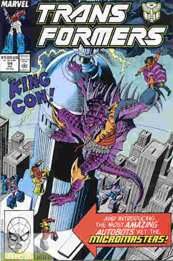 “King Con!” WRITER: Bob Budiansky PENCILER/BREAKDOWNS: José Delbo INKER/FINISHER: Danny Bulanadi COLORIST: Nel Yomtov LETTERER: Jim Massara EDITOR: Don DaleyTo replenish their ranks, Optimus contacts Cybertron for back-up. What they send are the Micromasters, downsized Transformers who, as Hi-Q puts it, “wield their independence like a club”. Their mission involves a sighting of Iguanus in the Jersey swamps, which also brings in reporter Cecilia Santiago. The Micromasters must learn to accept Cecilia’s help because Scorponok and the Pretenders have a plan to gather energy by causing a lighting storm and using Manhattan island as an energy collector, which will kill anyone in the area of the device. Brash and kind of jerks, the Micromasters are able to stop the Decepticons’ plans but decide they will remain in New York with Cecilia rather than run from the authorities.