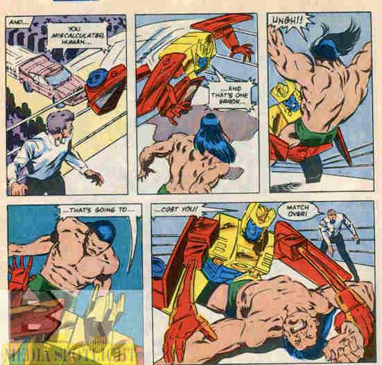 Roadhandler wins a wrestling match with a human. Not surprising. (from The Transformers #55)