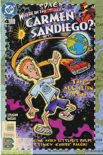 The chief of GROK (Galactic Research Operating Kernel) has been trying to obtain Evan’s services…but her messengers land in the wrong spot and keep getting drafted to work on a farm. Carmen, with the help of the literal-minded Avery Littlebit Phelps, has stolen the rings of Saturn, and will also pursue the volcanoes of Mars and the eye of Jupiter to use the constellation Cassiopeia as part of her continued attempt to control time. (The comic ended before we could get a Where In Time adaptation.) While Evan keeps trying to figure this out on his own, he realizes he needs the help of the ship’s computer, Val 9000, and jazz singer Stinky Cheese. For the final battle to stop Carmen, Evan’s ACME pals pop up to help save the day.