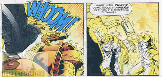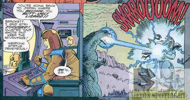 Godzilla is pointed towards Vancouver (I guess he hasn’t had enough of America after his US tour in the Marvel universe) and the only thing standing in his way is Cybersaur, a piloted, dinosauresque robotic vehicle armed with huge shoulder missiles (to remind you its the 1990s) with guns on top, and really huge shoulder pads (90s! WE’RE THE EXTREME DECADE!!!!!!!!!!!) Cybersaur makes the first strike, but because they were in a hurry their CO forgot to wait until the battery was fully charged. This is not going to end well, even with Godzilla suffering a poison that’s causing him to bleed from the mouth constantly.