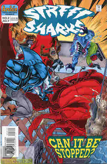 The Sharks aren’t able to take out the giant crab. Then they get some help from, and are kidnapped by, underwater dwellers from the Atlantis-like Aquaria (at least the arc title now makes sense), where they’re actually welcomed once they learn the Bolton brothers’ identities. Streex even makes the acquaintance of Kara, daughter of Aquaria’s leader, and the two develop a fondness for each other. On the surface, Parahnoid takes advantage of the situation to get in good with the Mayor and get an advantage against the Sharks. Back in Aquaria, Streex and Kara learn that instead of curing the crab the scientist has orders to prepare it…for an attack on Fission City!