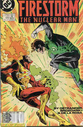 Centuries after an alien race destroys a planet, some surviving organism ride a shard of the planet to Earth. (I’m assuming this was part of a future story I don’t own, or it would make no sense to be here.) Meanwhile, Ronnie tries to figure out how the new Firestorm, who seems to have his own personality, and a strong dose of naivety, as demonstrated when Ronnie comes across a black man being chased by racists who want to burn him alive. Green Lantern (Hal, who gets to stay conscious this story) happens to be in the area and tries to put out fires caused by Firestorm’s rescue that led to a ricocheted bullet blowing up a gas pump. The man convinces Firestorm to let it burn, not realizing the cost to his friends still below, one of which is killed. While this goes on, a Russian agent continues to have his suspicions about Mikhail, who gets his children back but at home was called to form Firestorm.