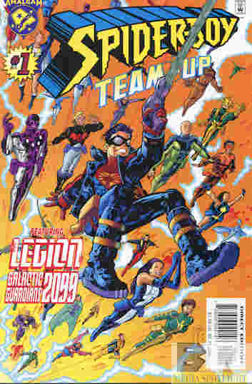 Now in the present he instinctively avoids Scavenger’s blast but is still in danger until the boy from earlier tries to help with the web-shooter he stole earlier. The kid is hurt by Scavenger’s Neuron Claw and the only way to save him is to send him into the Phantom-Negative Zone. Then the robed man shows up again to kidnap Spider-Boy. He plans to pull him back into Spider-Man and Superboy and absorb the amalgamated energies until the Spider-Boy of 2099, Mig-El Gand, is able to travel to the robed villain’s dimension. First calling himself Kang The Conqueror, the enemy is revealed as Chronos-Tut, the Time Pharoah, a mutual enemy of Spider-Boy and the Legion. By destroying his mask, the limbo falls apart and everyone returns home as Spider-Boy prepares for his marriage to Insect Queen.