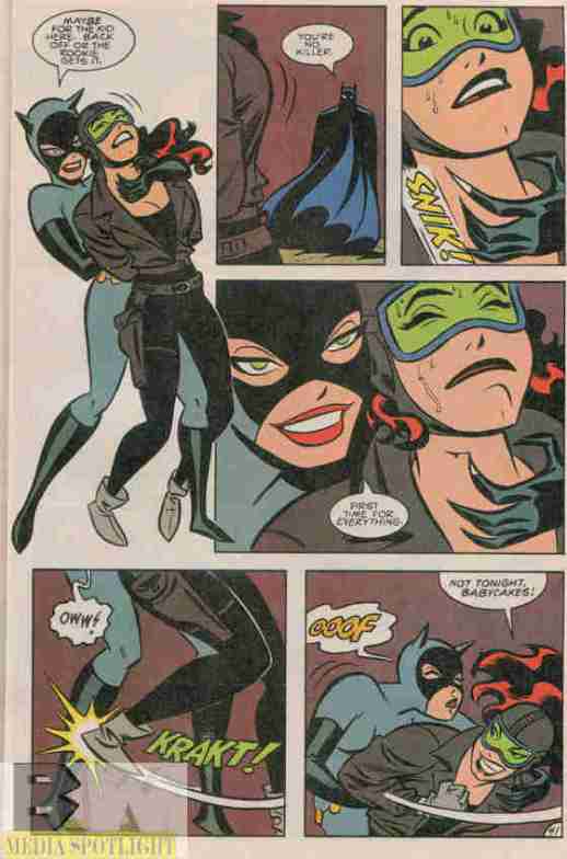 Catwoman threatens Roxy Rocket to get Batman to back off. Like Roxy wasn’t mad enough. (from The Batman Adventures Annual #1)