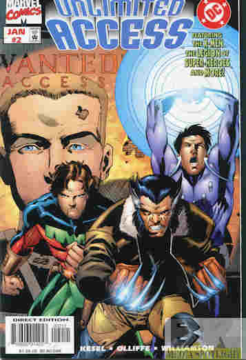 The Legion defeats the Sentinels, but Wolverine takes them away before more arrive. Braniac 5 creates a device that disrupts the inhibitor collars used on mutants during the “Days Of Futures Past” period, which allows them to fight the Sentinels. Access takes the Legion back to the DCU but as soon as they’re through everyone forgets about them. As Access tried to adjust the portal to get him home, Magneto shoved him in to protect him from a Sentinel attack, and he ends up bouncing around time until he’s pulled in by Morty, the bum that unlocked Axel’s powers. “Morty” lets slip that he’s actually Axel from the future, who tells him to find an anchor and that he needs to travel constantly to keep the universe apart. As he begins to tell him what else the Amalgam universe brings him a huge door opens and “Morty” escapes because the two of them together is opening that door. Coming through it is Darkseid and his legion. The early Avengers come to his aide and Access triggers the original Justice League to help, but Amazing Grace uses her power to send the male members of both sides against each other.