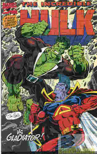 Kona-Lar, the only female general in this story, leads her team to the Pantheon, the science stronghold where Bruce Banner (still during the ‘Hulk 24/7″ period) was trying to have a romantic nighttime picnic with Betty. (Frankly, I didn’t know Bruce and Betty ever married…and considering he’s always Hulk, it brings up the kinds of questions that ruined the Clark/Lois marriage.) The Kree trio try breaking into the Pantheon but Hulk, Ulysses, and Hector stop them. Like Dylon-Cir, Kona-Lar tries to convince the heroes that they need the weapons to fight their oppressors, but when Hulk says he wants to check out their story, the villains attack. The heroes win and Gladiator shows up to collect the prisoners. Since Gladiator’s manners are seriously lacking, he and Hulk come to blows before Lilandra recalls him and Starbolt. Hulk lets them take the prisoners.