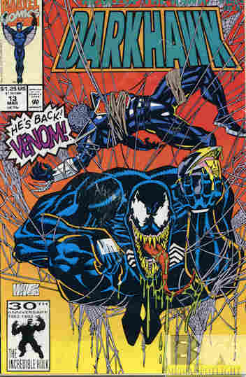 As Tombstone uses Hammerhead’s scientists to study the amulet, Darkhawk feels the pain from the probing. He doesn’t have time to worry about that or another failed attempt to get info from St. Johnny. He’s decided to go after his father first instead of the amulet. Found out after sneaking aboard a plane bringing Bazin’s stuff to an island base he has, a fight sends the plane crashing with only Darkhawk surviving…just in time to run into Venom! After he believed killing of Spider-Man (who tricked Venom into thinking he was dead) Venom retreated to what turns out to be Bazin’s island, and he doesn’t like the uninvited superhero dropping in. Meanwhile, Grace doesn’t get any info from Lennox but does see the Savage Steel armor being stolen and follows the thieves only to get caught.