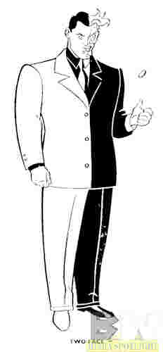 Our series will be unique in that we will show Harvey Dent not only as Two-Face, but, in at least the first few weeks of episodes, as Gotham City’s justice-minded district attorney. Two-Face’s story is too emotionally rich to do as one episode, and the tragedy of his condition will be made all the more real if we first meet him as Batman’s closest ally in the Gotham legal system. In these stories we’ll show the beginning of the trust and friendship between the two men, all of which will be irrevocably destroyed along with Dent’s face. He’ll blame Batman for what happened to him, and will not rest until he’s hunted down the Dark Knight and killed him.