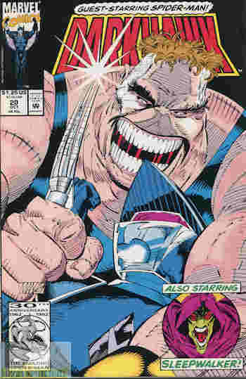 “Portals Of Power” part 2: “Sleepwalker’s Rage” WRITER: Danny Fingeroth ARTIST: Mike Manley COLORIST: Joe Rosas LETTERER: Bill Oakley EDITOR: Nel YomtovSleepwalker appears demanding to study Portal’s armor in the hopes it can take him home, not aware that it’s Portal’s powers and not the armor that allows him to traverse dimensions. Sick of this nonsense, Portal escapes, leaving Sleepwalker enraged at losing a potential way back home and Darkhawk angry about losing the only link to finding out where his form comes from. Spider-Man tries to play peacemaker between the two, since their mutual enemy is the Brotherhood Of Mutants (currently led by Toad of all people, and featuring the Blob, Sauron, and Phantazia). Portal goes to a tribesman who may be able to give him advice but the Brotherhood tracks him down and kidnaps him, Sauron using his mind control powers to make him serve the Brotherhood. Instead he tricks them and makes them appear in Times Square instead of a weapon depot Toad wanted to hit. The Brotherhood clashes with our heroes, but Portal ends up stranding Spider-Man in another dimension before making their escape, sending a sign crashing down on the humans below. Sleepwalker follows the Brotherhood through their gateway, leaving Darkhawk alone to hold a heavy sign. (concludes in Sleepwalker #17) And while all this was happening, someone else in Hawk armor is coming to Earth.