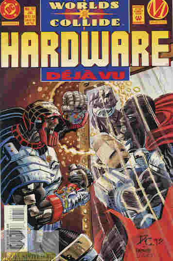 (continued from Superman: Man Of Steel #38) In Dakota Fred Benson has gone to a research lab that Alva happens to own. Learning that Fred gives off a lot of energy when he disappears to Metropolis, Alva uses Hardware to scan him when he makes the transition. However, when Fred goes to sleep Hardware travels with him to Metropolis, still recovering from Luthor’s “safeguards”. There he saves a woman from being raped by some more of those paramilitary guys that keep popping up for some reason during “Fall Of Metropolis”, but when he returns to Fred he has a strange vision in which he’s in a mirror, which is smashed by Steel (not that he knows who Steel is, mind you) and that conscience Curtis claims to not have seems to differ with him before Fred wakes them both up back in Dakota with a copy of the Daily Planet. While he says he still wants to help Fred, Alva instead sees a second world to exploit. (continues in Superboy #6)