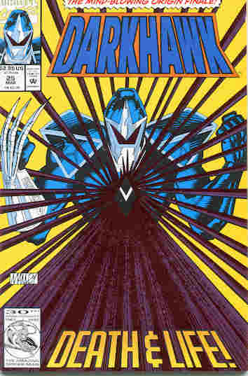 Missing issues annoys me but some time last issue Dargin, going by the name Evilhawk, accidentally disintegrated the Darkhawk body, leaving only the amulet behind. Chris, however, wakes up on a spaceship in null space and learns the history of the Darkhawks. Created by Dargin Bokk to be disposable, repairable solders he could use himself or rent out, he kidnapped scientists from around the universe, even Earth, to create his project. Realizing what he was doing was wrong, both willing and unwilling scientists used the bodies to rebel, but Bokk obtained the Evilhawk body and its special properties. Another Hawk, Osch, ended up merged with the ship. Bokk was expelled from the ship and his proper body destroyed with others. Two others were psychically sent to Earth and merged with two humans, one of whom went mad with the two personas and became St. Johnny, but not before they created the Darkhawk amulet in case Bokk returned.