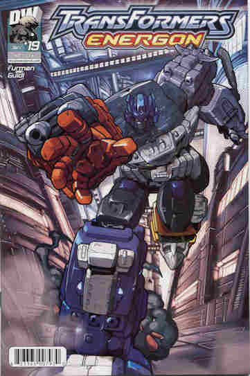 10 years have passed since Armada and Cybertron is finally rebuilt. Optimus is worried that Unicron may still come back, which the council doesn’t want to hear about. Going to see Over-Run and meeting his new creations, the Omnicons Sky Blast and Signal Flare, Optimus learns that there is a certain communication node that will allow him to talk to the planet itself. Using it he sees visions of Unicron and his new servants, a group of disgruntled former Decepticons calling themselves Terrorcons, led by Scorponok. Starscream interferes with one of their destruction raids and Scorponok blasts him. Tidal Wave tries to get rid of him and is damaged for his troubles. However, Unicron makes him more powerful (and into his pre-Mirage Energon form) through his servant, Alpha-Quintesson. In the vision, Optimus sees Scorponok lead the Terrorcons through a portal before being interrupted by Megatron, whose spark is trapped within Unicron demanding to be set free. He does tell Optimus where the Terrorcons are heading…a supply of Energon on Earth! Meanwhile, Alpha-Quintesson sends the four Transmetal molds from the Armada line captured last issue, now brainwashed into being Unicron’s heralds, to attack Cybertron to keep them out of the fight.