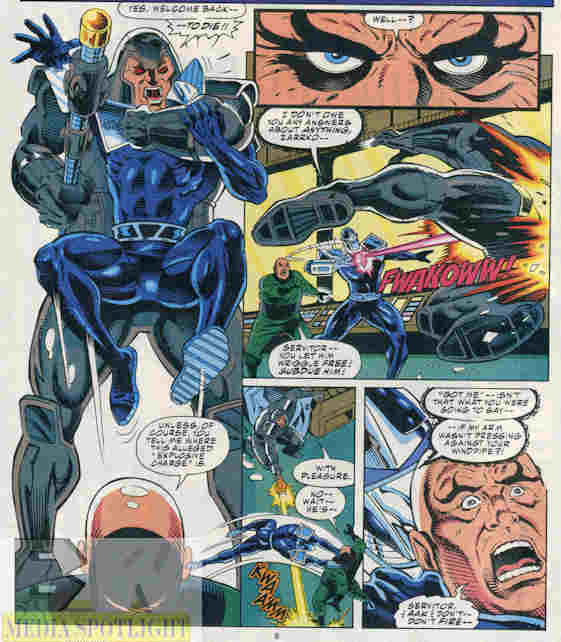 Darkhawk gets himself invited back to Zarrko’s ship to disarm his bomb. Servitor welcomes him back with a big hug.