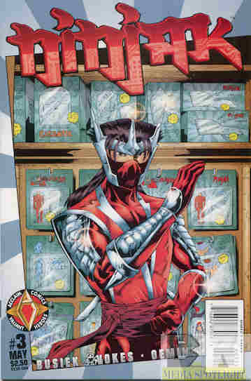 Hoping to find some answers to his powers, Ninjak goes to the offices of Acclaim, and learns the name of game’s creator, whom Zeer claims is a monk that he wants to keep Ninjak away from. The man at Acclaim convinces our hero take over at the promotional event at the mall, and Zeer uses the opportunity to strike with three new Dark Dozen members–Gigantik (a giant rock guy who gets larger as he eats), Shurika (an evil ninja), and Nixie (who can turn into a water elemental). Without the tools in the game, Ninjak has to improvise, fighting his killer instinct, until Town notices Zeer. Ninjak grabs Zeer and according to the rules Ninjak wins. With that solved and Annie embarrassing him at the dinner table over Shelley, Denny needs to find the monk…which means sneaking off to Maine.