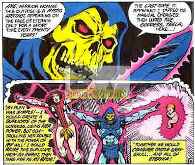 That’s right, kids. Skeletor was going to raise a baby to be his wife. That is so messed up I can’t even begin to explain it, although I shouldn’t have to. That’s taking the concept of “child bride” a bit too far, I don’t care how old she was going to be when old bonehead was going to pull it off. Meanwhile, he’s been trying a ton of other ways to take over Greyskull because maybe even he woke up one day and said “wow, that’s a really messed-up plan, let me try something else first”.