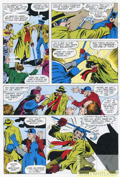 Now watch me stumble on a fight after this that would have fit completely. Still, playing the hand I can, Batman has been investigating a serial killer of the homeless, thinking he is rescuing them from life on the streets by leaving them dead in the gutter. Injured during their last encounter, Batman fights with a sling holding his right arm in place as the killer returns.