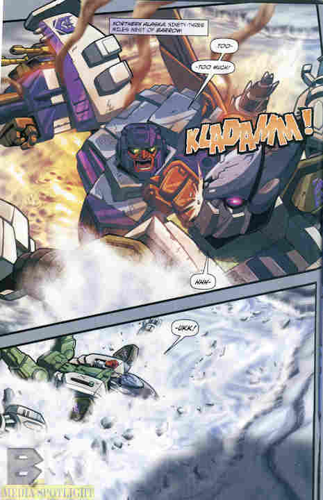 Thrust has gone to the arctic to find a crashed Mini-Con shuttle. Cyclonus, superpowered by a whole lot of Mini-Cons, has gone mad and ends up there as well.