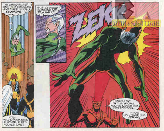 Storm sets Quicksilver up and Cyclops knocks him down. (from Adventures Of The X-Men #5)