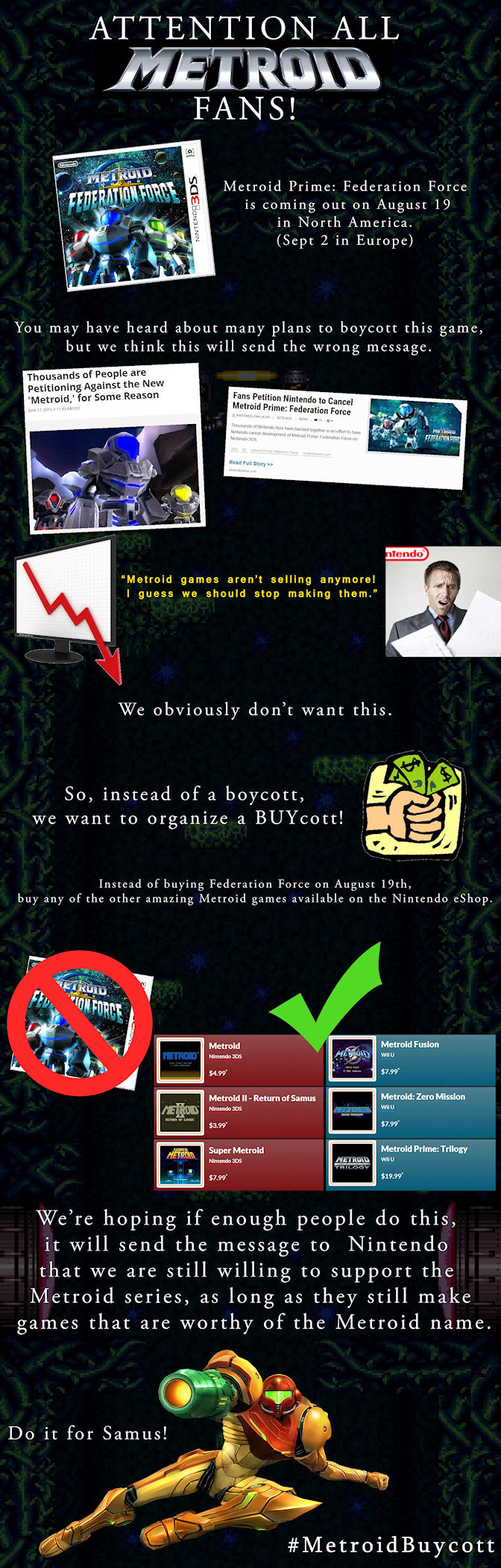 Also, from what little I’ve seen and what little I know of the franchise’s story, Federation Force didn’t need to be a Metroid game. However, demanding Nintendo purposely take a financial hit that may damage themselves in order to supposedly protect the brand is inconsiderate and just plain crappy on their part. Plus as the graphic said, it might tell Nintendo there is no interest in the franchise. Buying the older games on the eShop, posting images of the game, seeing if you can get in a Let’s Play before Nintendo ironically has it taken down, or buying merchandise (surprised they didn’t mention that for fans who own all the games already in some, hopefully legal, form) is a better way to send the message “we love the franchise, just not this entry”. I may also suggest that these games may bring people into the franchise…or would if single-player didn’t still have the same enemy level as four-player mode. Serious, why did you think that was a good idea, Nintendo? Not everybody likes playing online and have three other Metroid fans as friends or relatives.