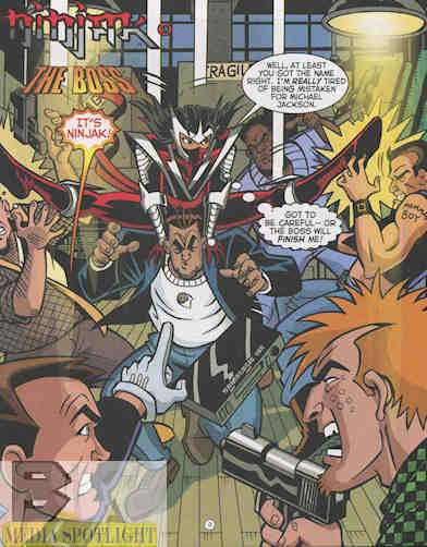 Ninjak jumps one guy and kicks two others in the face. (from Acclaim Adventure Zone: The Boss)