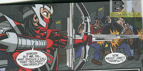 Ninjak uses his bow to fire golf clubs like arrows at the thieves. (from Acclaim Adventure Zone: The Boss)
