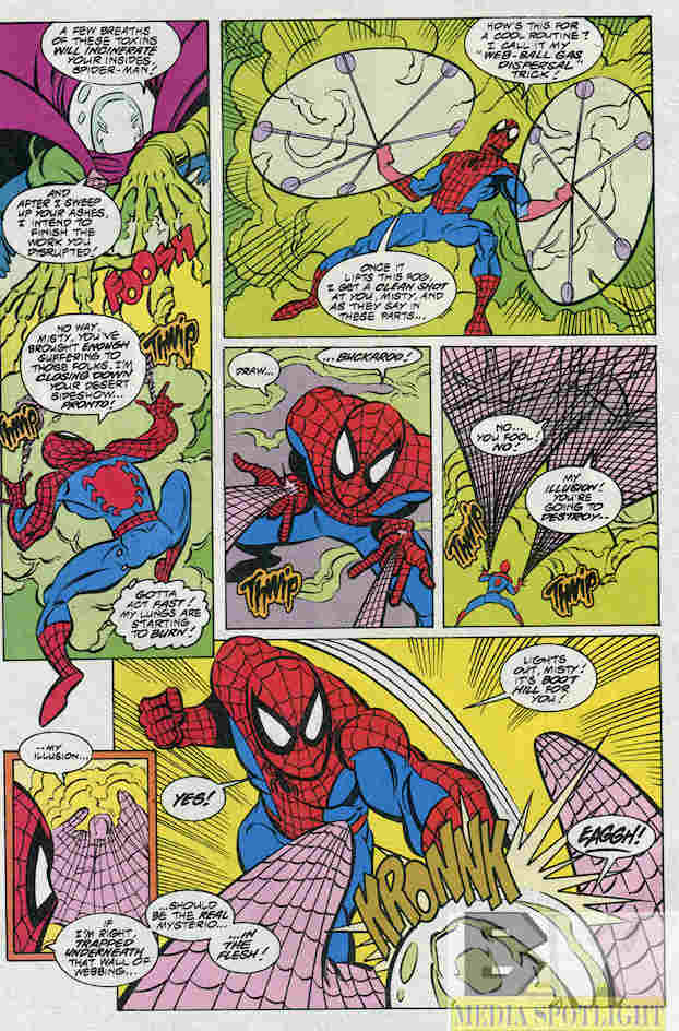 Spider-Man blows away Mysterio’s gas, and then knocks out Mysterio. (from The Adventures Of Spider-Man #9)