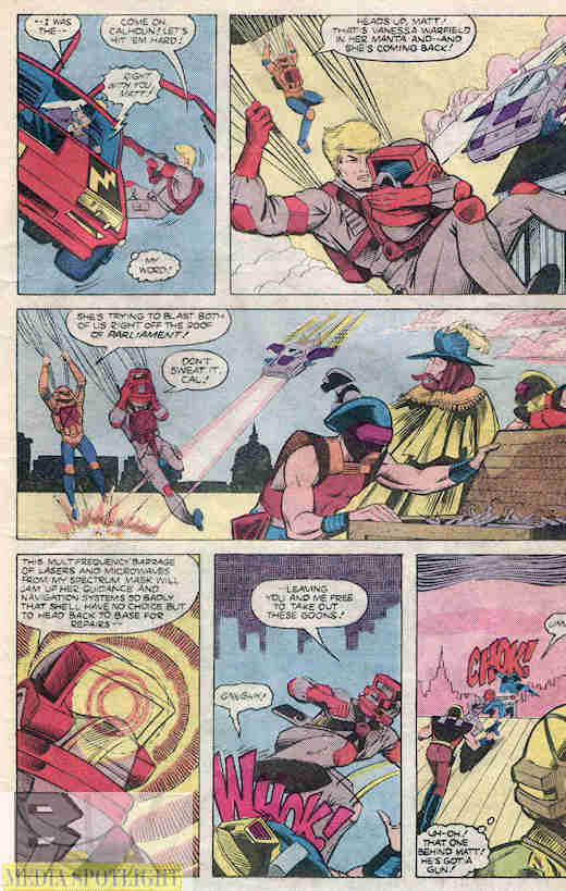 Matt Trakker and Calhoun Burns drops in on VENOM and a guy who thinks he’s Guy Fawkes trying to blow up Parliament. (from MASK #3)
