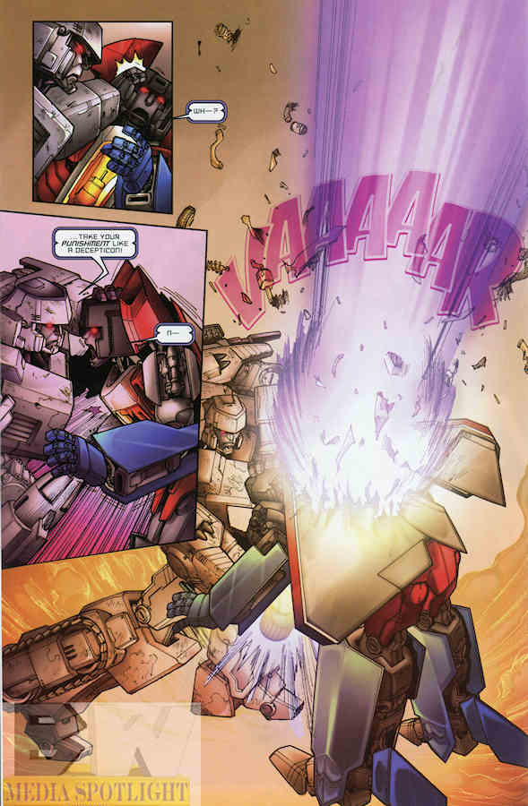 Megatron blows a whole in Starscream’s chest. A hole the size of Starscream’s chest. (from Transformers: Infiltration #6)